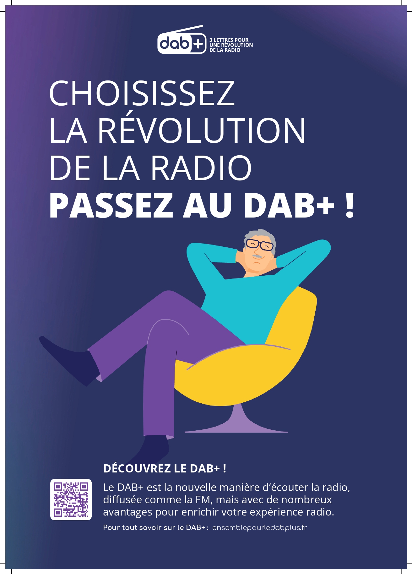 Le DAB+ est une technologie présente dans certains postes de radio qui permet d’enrichir l’offre de radio, d’améliorer la qualité sonore et d’assurer une continuité d’écoute, sans changement de fréquence. Il est disponible pour environ 80 % de la population et continue de se développer rapidement.